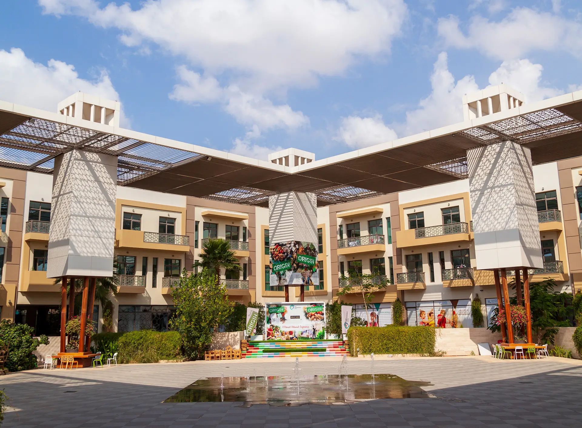 The Sustainable Plaza is a mixed-use development located at the entrance of The Sustainable City - Dubai. It comprises retail and residential units, which achieve energy efficiency thanks to rooftop solar panels and energy efficient lighting.